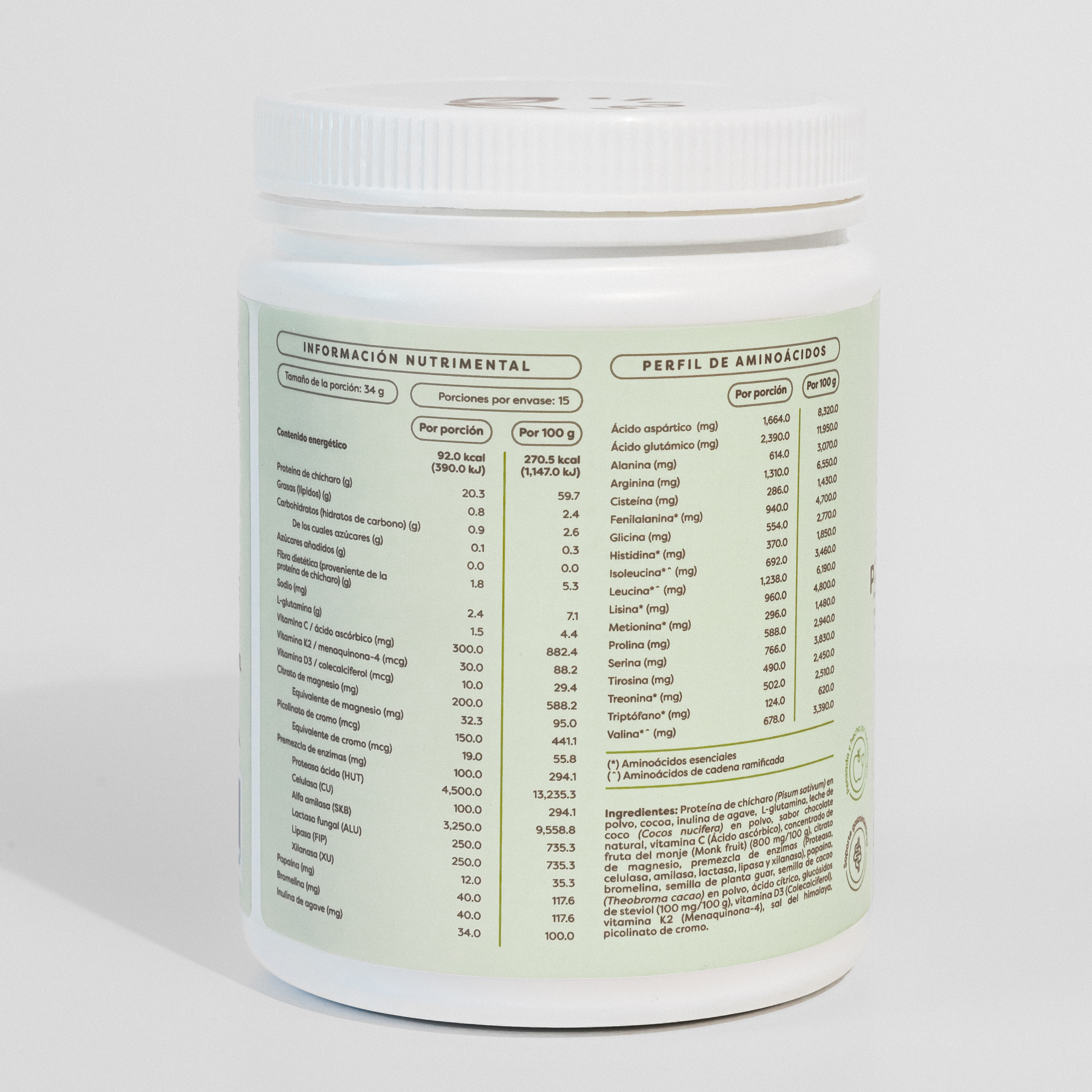 La mayoría de las proteínas veganas vienen del chicharo y del arroz, en este caso solo proviene del chícharo, lo que aporta mayor fibra y menor índice glucémico. Está adicionada con diferentes nutrimentos para que no solamente sea amigable con la digestión, sino que ayude a mejorar los trastornos gastrointestinales.